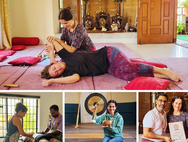Je découvre le yoga peu de temps après mon arrivée à Bangalore et le pratique en groupe. C’est auprès de Yogasharya Rakesh et Yogi Trupteesh Nagaraj Hurikadale que j’acquière les bases du hatha yoga traditionnel lors de ma formation initiale de professeure de hatha yoga à Gokarna.
